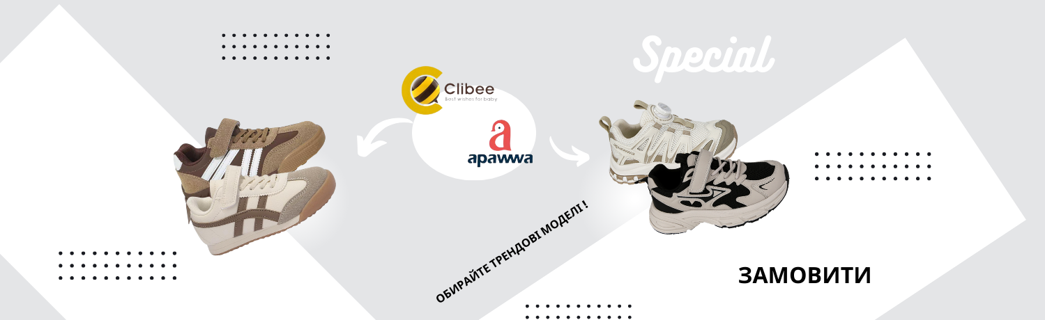 - Clibee – взуття для дітей оптом цього виробника має високий попит у всьому світі. Виготовлене з екологічно чистих матеріалів, воно відповідає європейським стандартам якості. Охоплює усі вікові категорії.